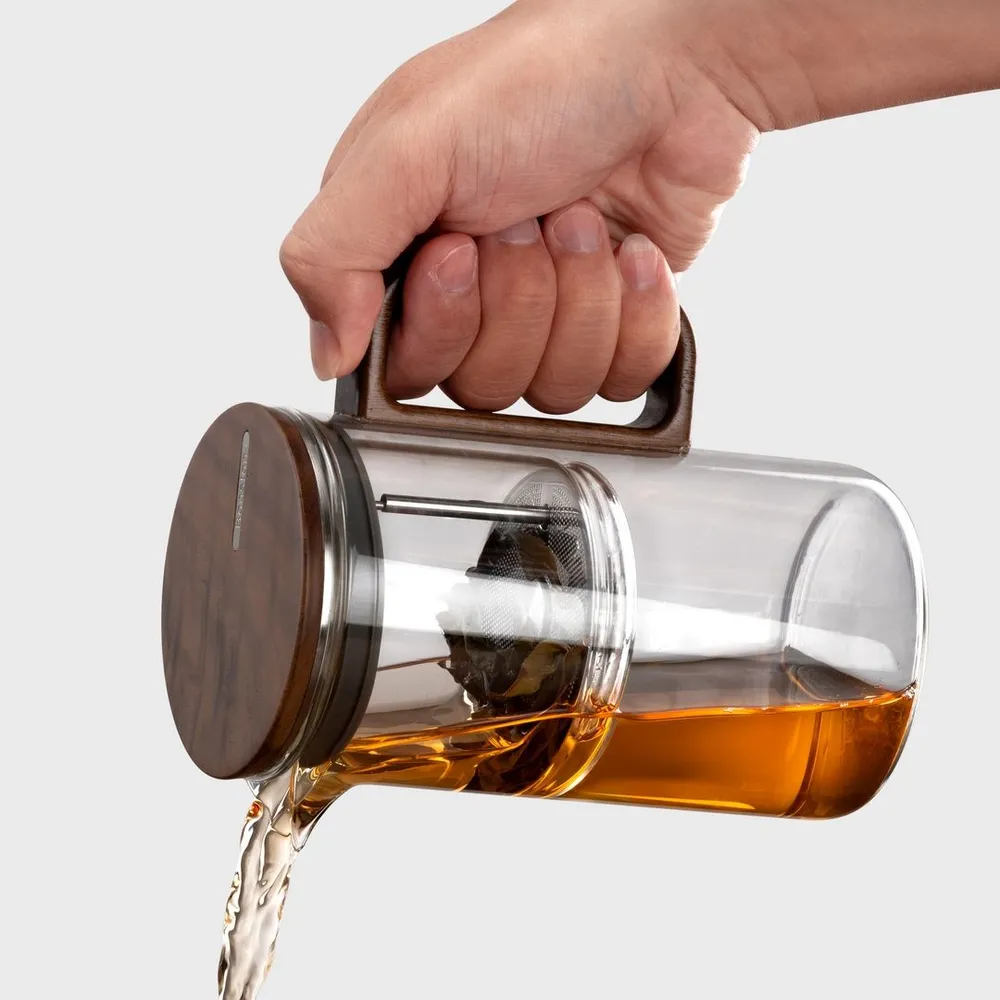 - Крышка и ручка из дерева: Крышка и ручка выполнены из американского ореха, что добавляет изделию благородный вид и приятную текстуру. Натуральное дерево не только красиво, но и практично — оно не нагревается во время заваривания.